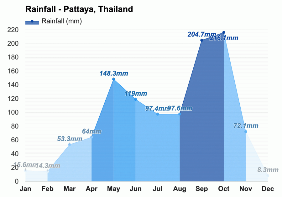 - Pattaya: ~1,100 mm per year – Moderate rainfall with brief but heavy showers, primarily from May to October. Being alongside the Sea, wind is also an issue blowing rain sideways which is not usually planned well for human dwellings. Flooding occurs in certain low-lying areas but usually subsides quickly due to improved drainage infrastructure.